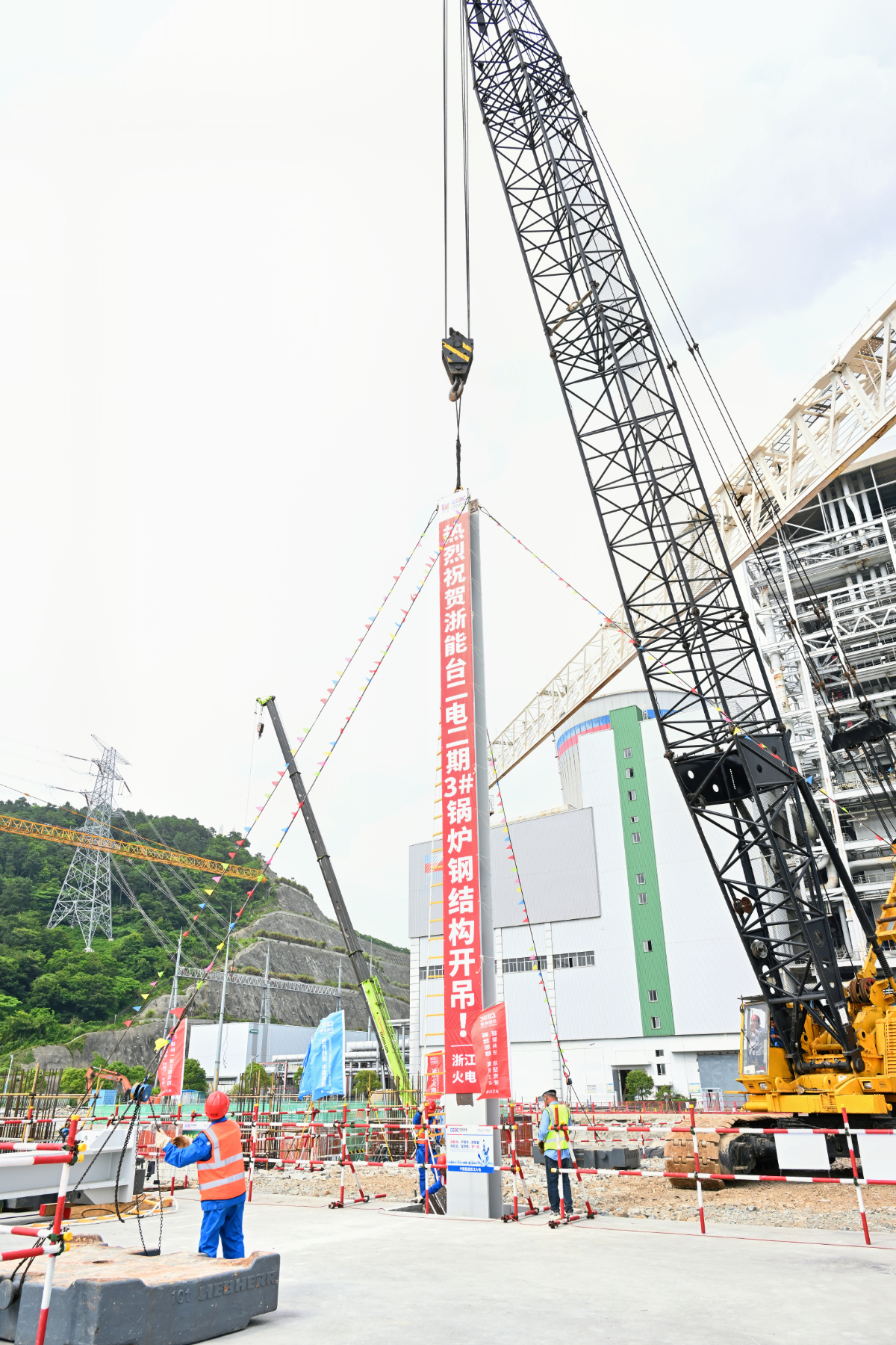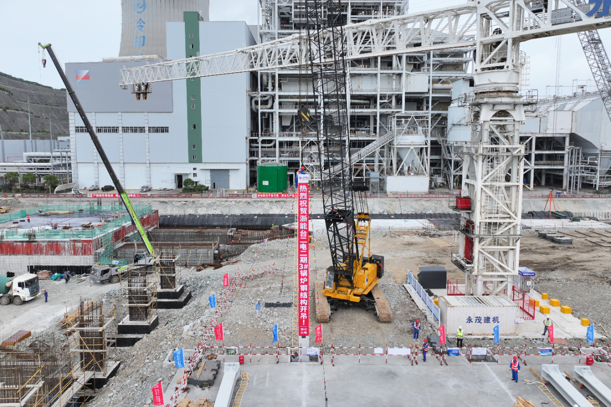 5月30日,臺二電二期3號鍋爐鋼結構順利開吊。 俞琬 攝