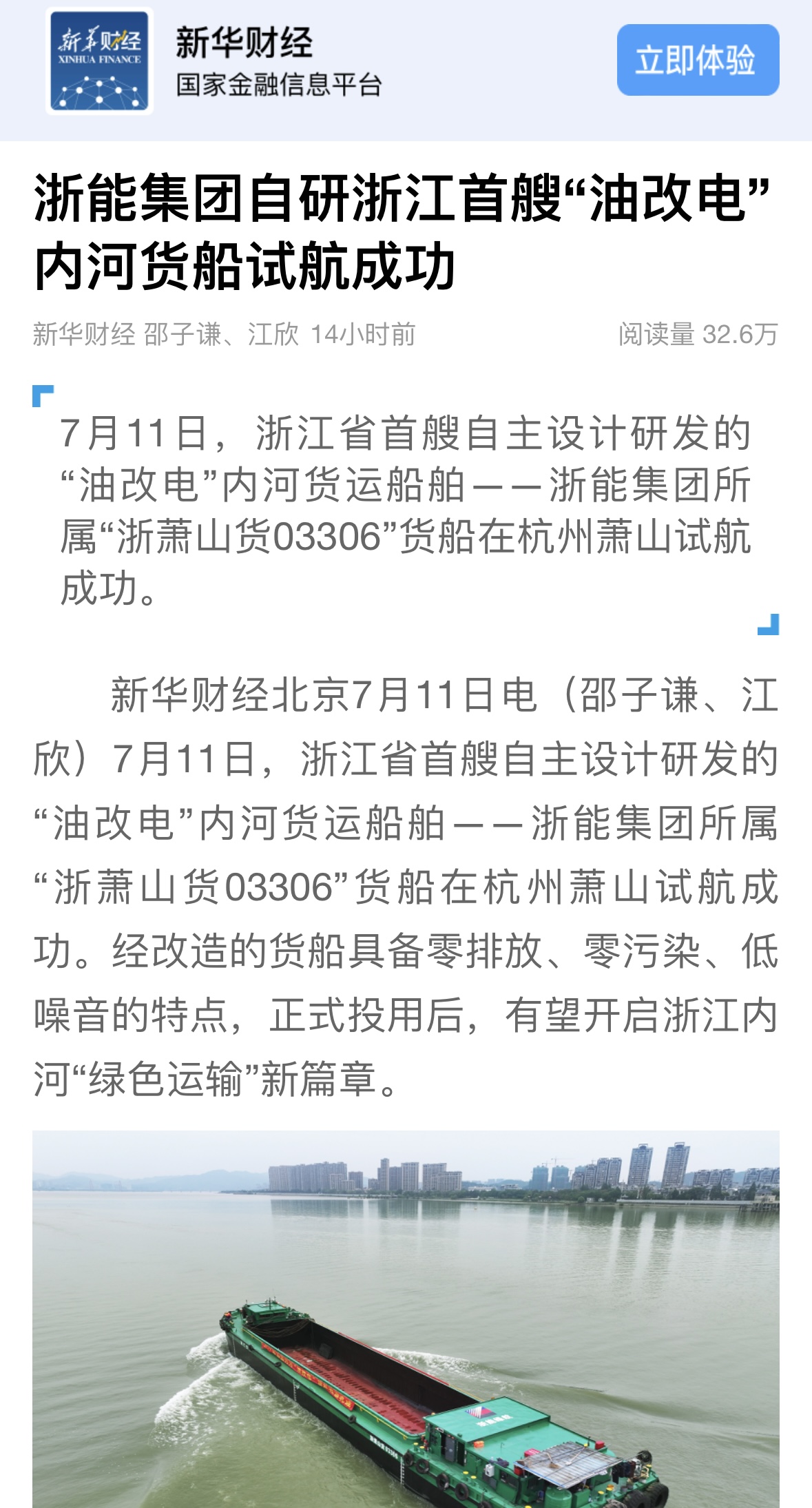 7月11日,浙江省首艘自主設計研發的“油改電”內河貨運船舶——浙能集團所屬“浙蕭山貨03306”貨船完成改造,在杭州蕭山試航成功。近日,新華社、中國新聞網、中國能源網、浙江日報、潮新聞、浙江在線、浙江國資等多家媒體聚焦浙能集團自研“油改電”內河貨船試航。