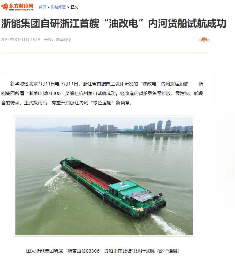 7月12日,東方財富網報道《浙能集團自研“油改電”內河貨船試航成功》。 東方財富網 圖