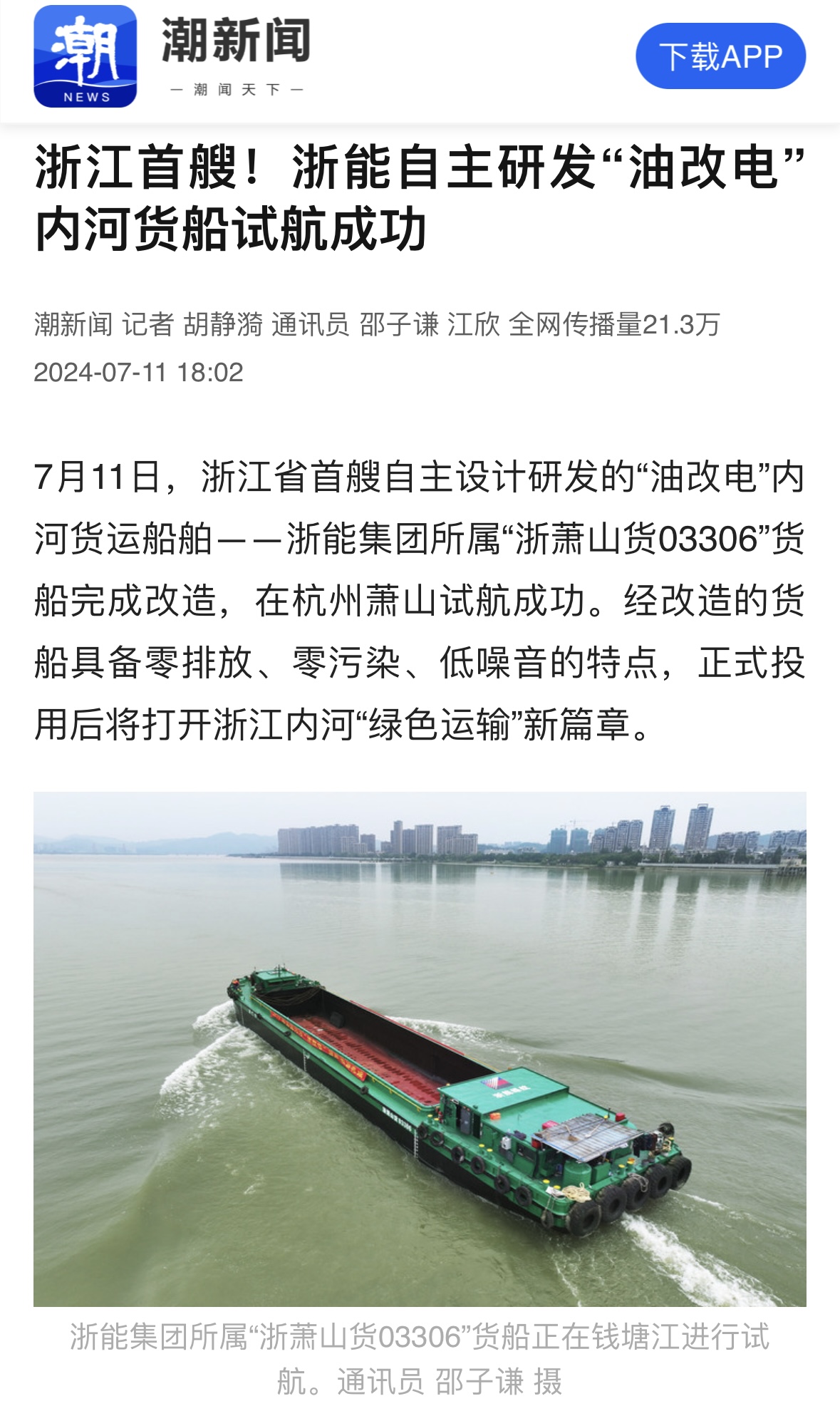 7月11日,中國新聞網報道《浙能集團自研“油改電”內河貨船試航成功》。 中國新聞網 圖