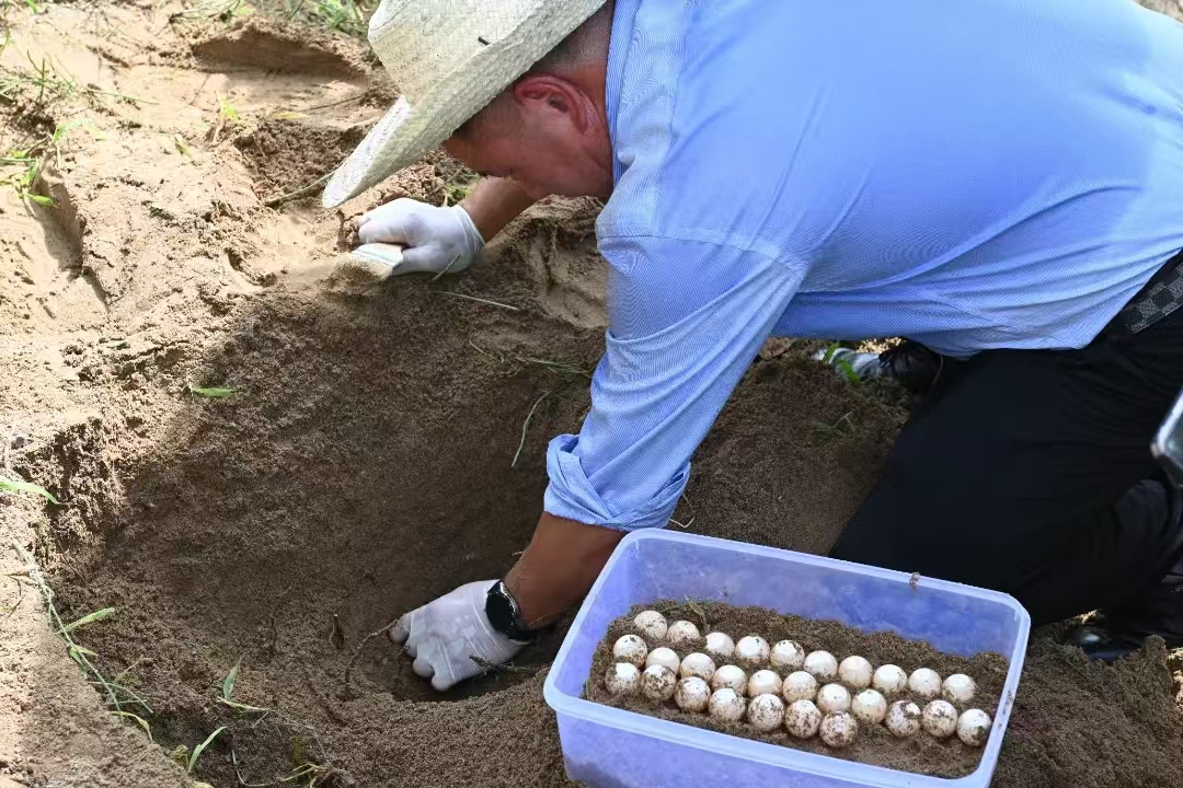 隨著表面黃褐色的沙土被撥開,在大約深30公分的位置,一枚枚雪白的黿卵也現出真容,葉承義用刷子輕輕掃開黿卵旁邊的泥土,小心翼翼將它們拿進塑料盒,帶回站內的控溫車間內進行測量、登記,以便孵化。