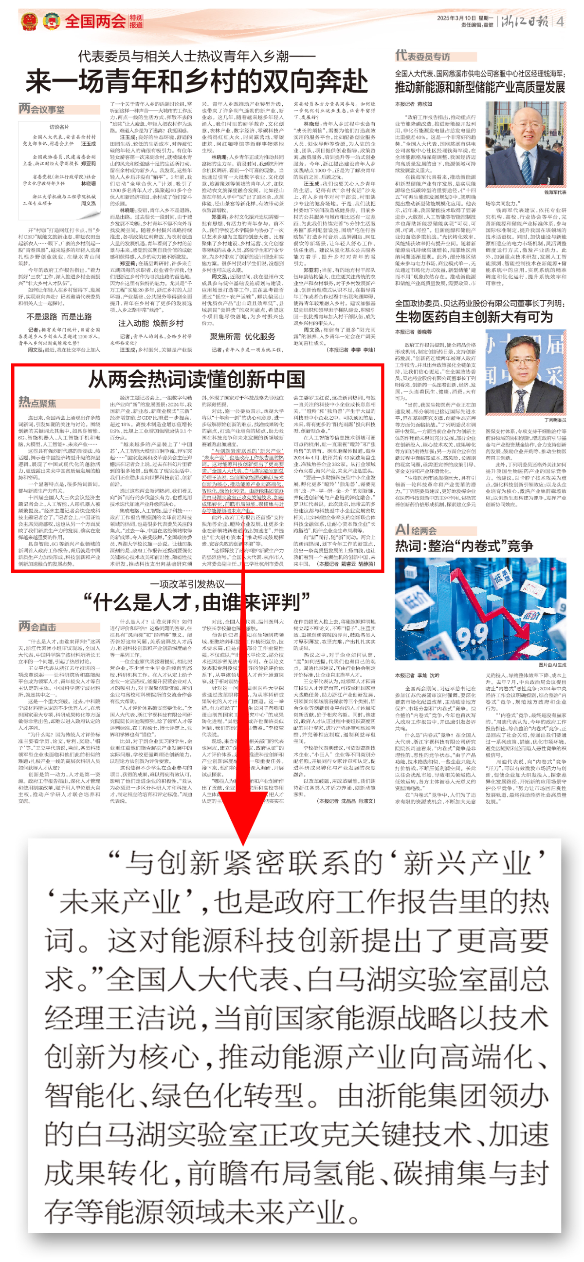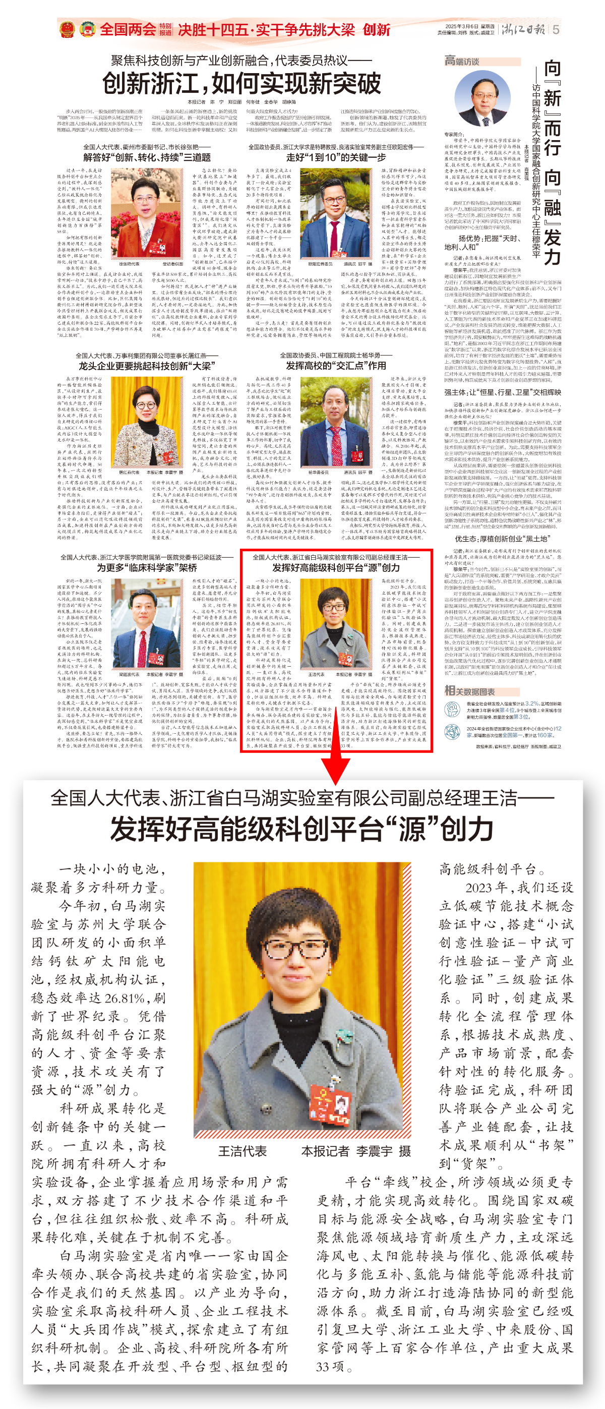 《浙江日報》全國兩會特別報道《全國人大代表、浙江省白馬湖實驗室有限公司副總經(jīng)理王潔——發(fā)揮好高能級科創(chuàng)平臺“源”創(chuàng)力》。 浙江日報 圖