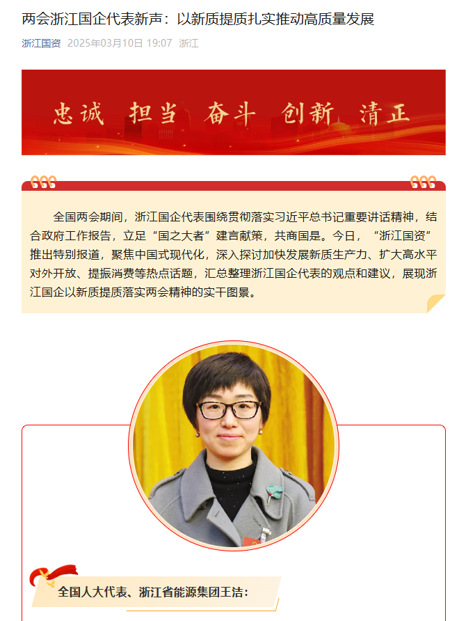 “浙江國資”微信公眾號報道《兩會浙江國企代表新聲:以新質提質扎實推動高質量發(fā)展》。 浙江國資 圖