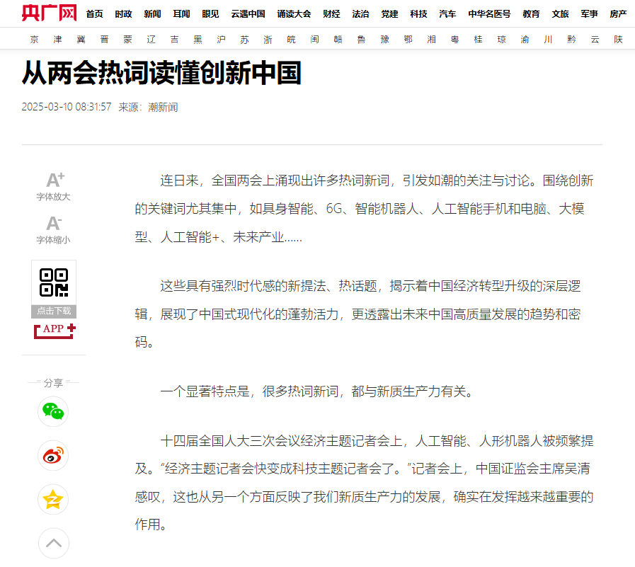 央廣網(wǎng)轉載《從兩會熱詞讀懂創(chuàng)新中國》,聚焦王潔同志。 央廣網(wǎng) 圖
