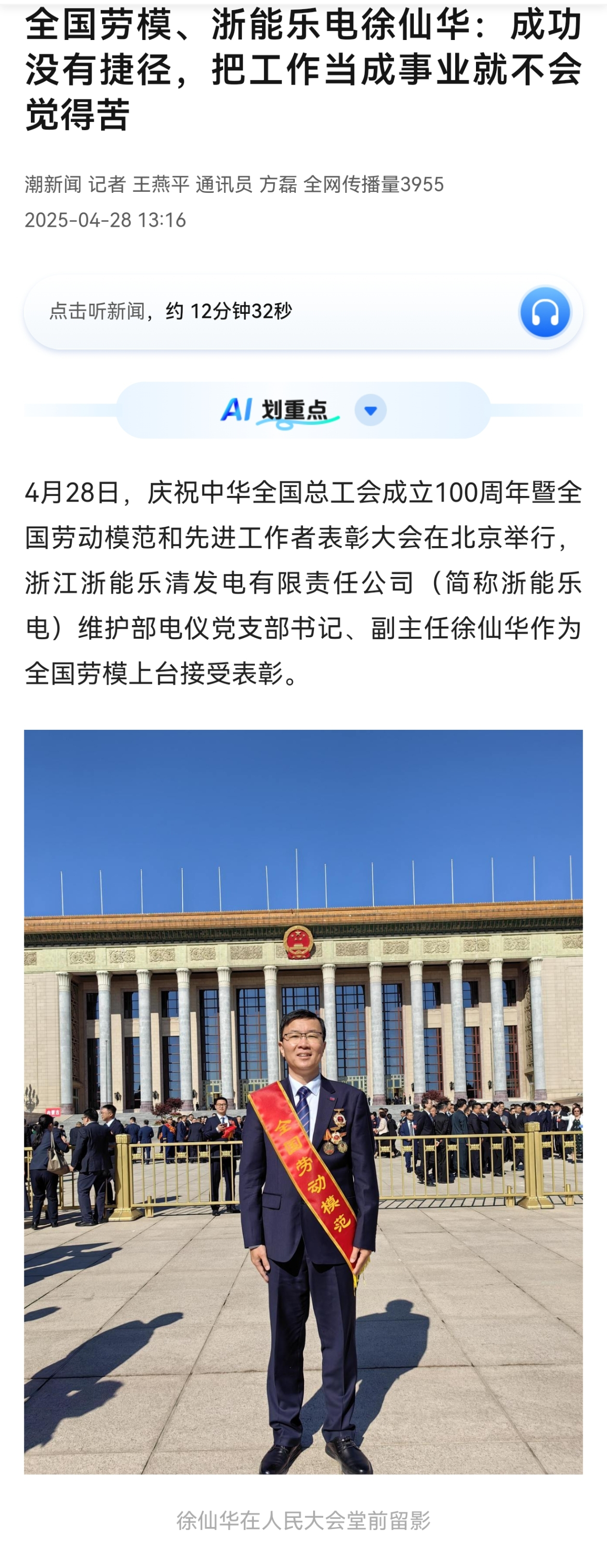 編者按:4月28日,慶祝中華全國總工會成立100周年暨全國勞動模范和先進工作者表彰大會在北京舉行,浙能集團所屬浙江浙能樂清發(fā)電有限責(zé)任公司維護部電儀黨支部書記、副主任徐仙華作為全國勞模接受表彰。新華社、浙江衛(wèi)視、錢江晚報、潮新聞、中國電力報、中國能源網(wǎng)等多平臺聚焦徐仙華同志多年扎根一線奮斗事跡。