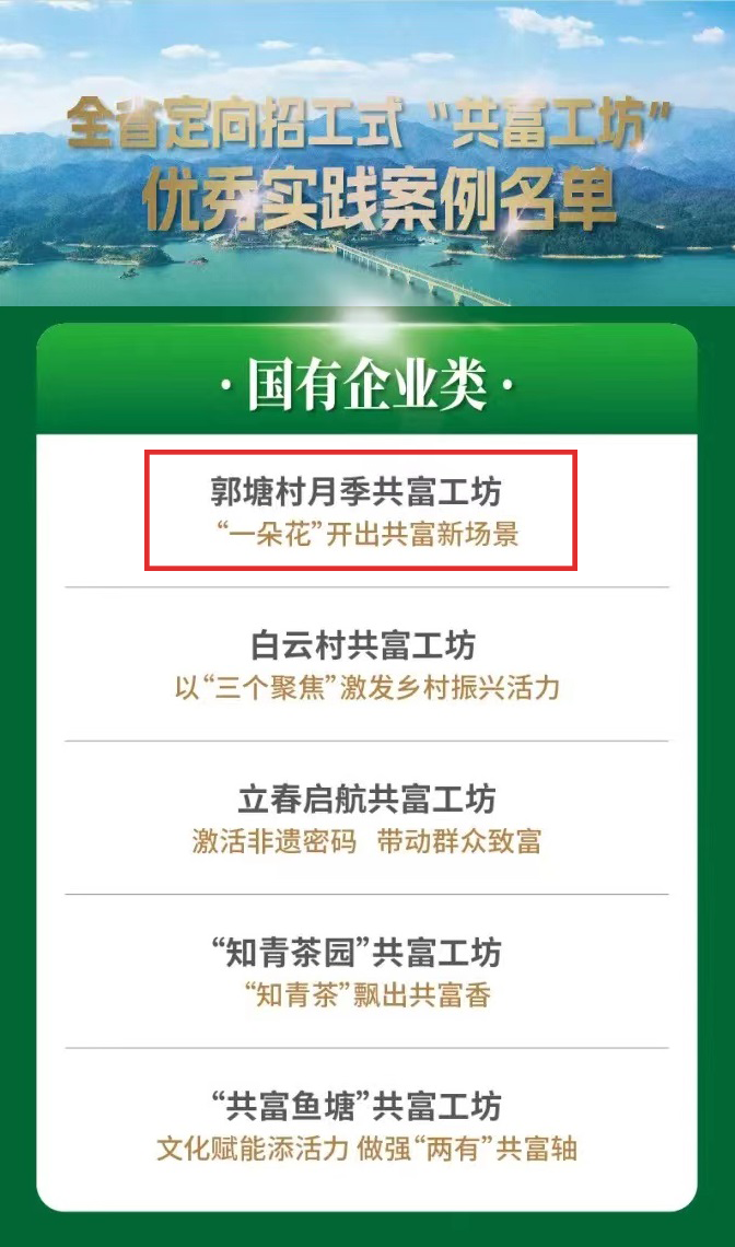 本網訊 日前,在全省深化定向招工式“共富工坊”建設推進會上,發布了5個方面50個全省定向招工式“共富工坊”建設優秀實踐案例,浙能集團投資建設的郭塘村月季共富工坊成功入選國有企業類優秀實踐案例,體現了浙能集團作為國有企業參與共同富裕示范區建設的責任與擔當。