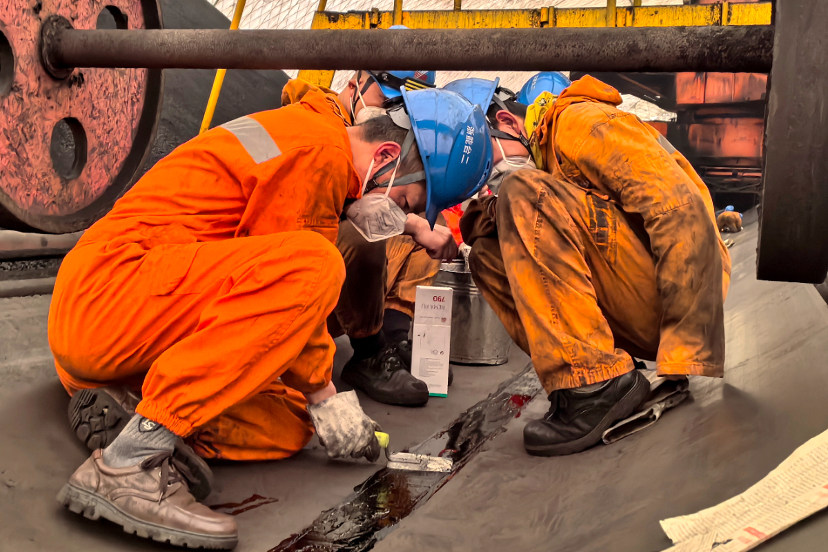 兩小時后,當新托輥終于轉動起來時,所有人都成了“煤人”,只剩牙和眼格外醒目。工作服被汗水浸透緊貼在身上,口罩里積滿了汗水,眼鏡片上全是水霧卻沒法擦拭,手套里還有滲入的煤粉。