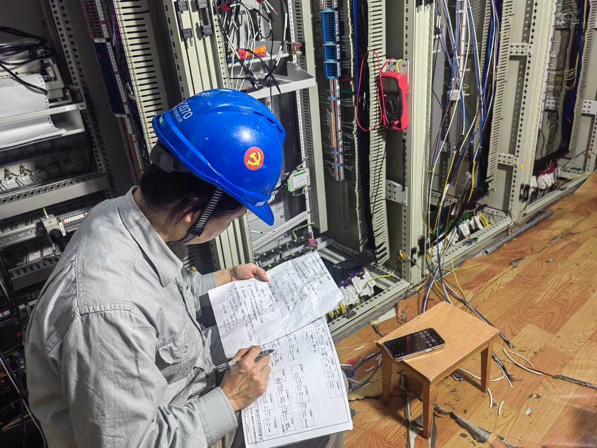 電子室是迎峰度夏的另一個戰場。從端子到圖紙,電氣女將陳涌君的手就是連接兩者的橋梁。她將復雜的電氣線路化為一條條整齊羅列的線索,密密麻麻的圖紙記滿了檢查的要點,指尖的繭記錄著她分毫析厘的專注。對她來說,經手的每一個數據都是維系安全的重要密碼,一個都不能出錯。