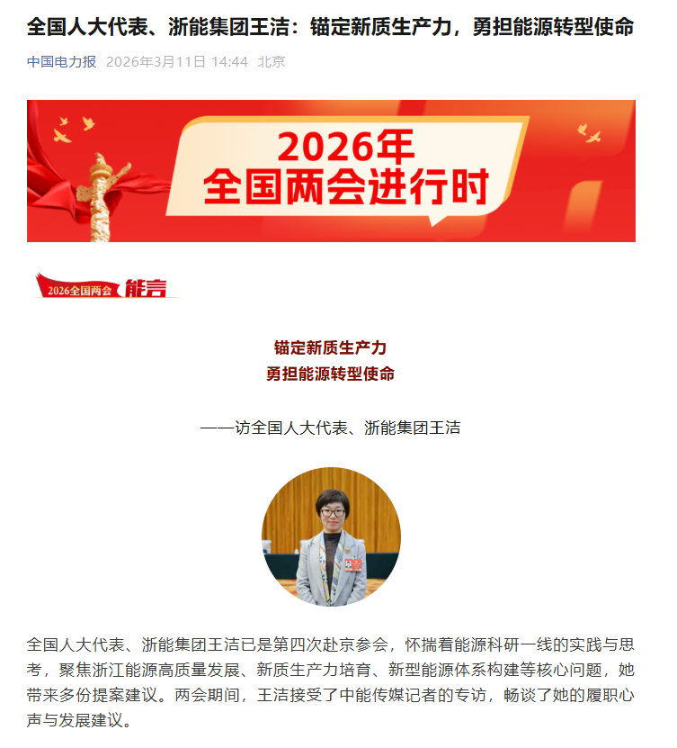 3月11日,“中國電力報(bào)”微信公眾號報(bào)道《全國人大代表、浙能集團(tuán)王潔:錨定新質(zhì)生產(chǎn)力,勇?lián)茉崔D(zhuǎn)型使命》。 “中國電力報(bào)”微信公眾號 圖