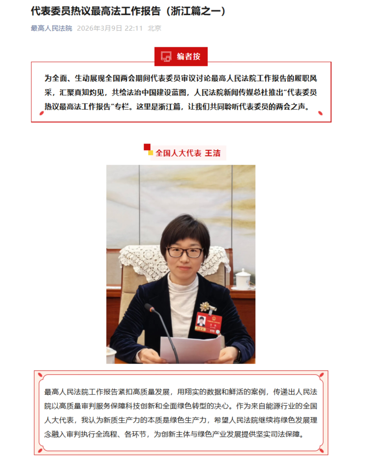 3月7日,浙江人大報(bào)道《王潔:為能源科研發(fā)展貢獻(xiàn)代表力量》。 浙江人大 圖