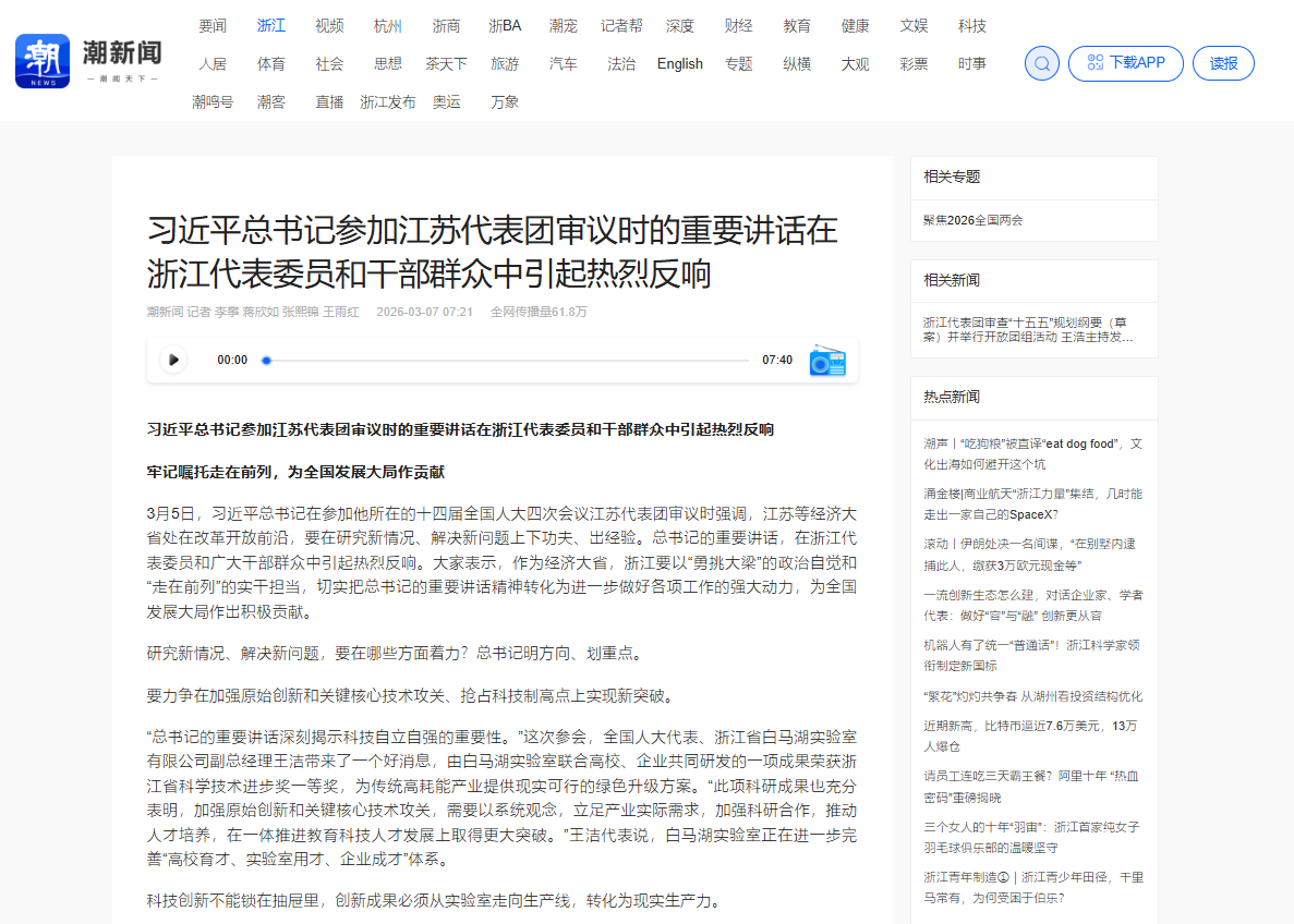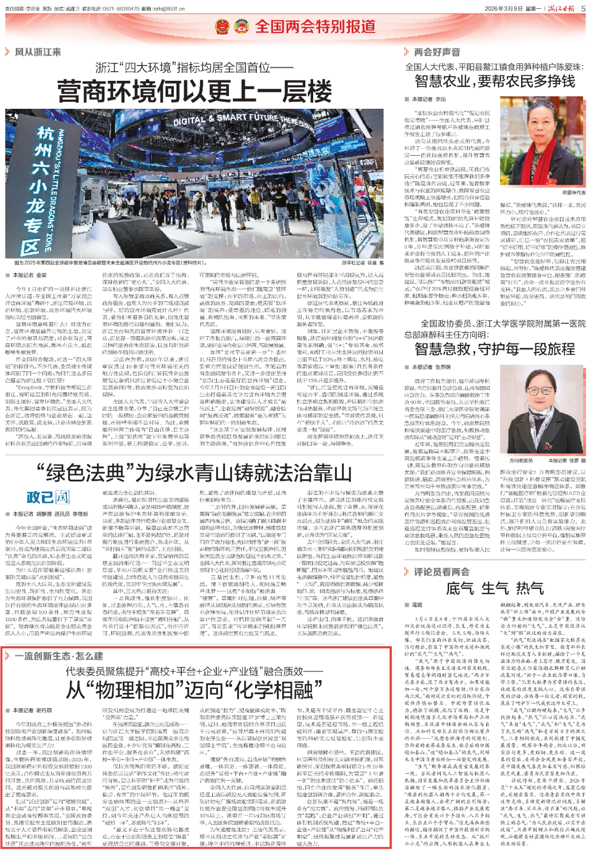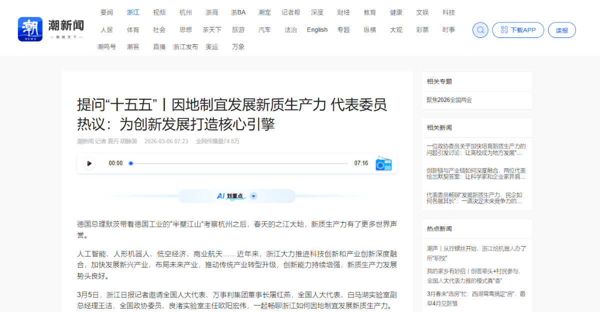 3月6日,《浙江日報(bào)》及潮新聞報(bào)道《因地制宜發(fā)展新質(zhì)生產(chǎn)力,代表委員熱議——為創(chuàng)新發(fā)展打造核心引擎》。 《浙江日報(bào)》、潮新聞 圖