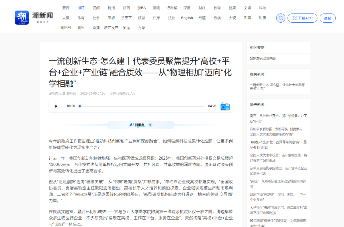 3月9日,《浙江日報(bào)》及潮新聞報(bào)道《代表委員聚焦提升“高校+平臺+企業(yè)+產(chǎn)業(yè)鏈”融合質(zhì)效——從“物理相加”邁向“化學(xué)相融”》。 《浙江日報(bào)》、潮新聞 圖
