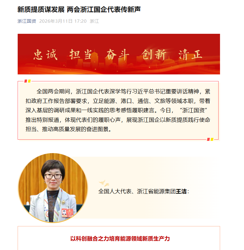 3月11日,“浙江國資”微信公眾號報(bào)道《新質(zhì)提質(zhì)謀發(fā)展 兩會浙江國企代表傳新聲》,就“以科創(chuàng)融合之力培育能源領(lǐng)域新質(zhì)生產(chǎn)力”采訪王潔同志。 “浙江國資”微信公眾號 圖