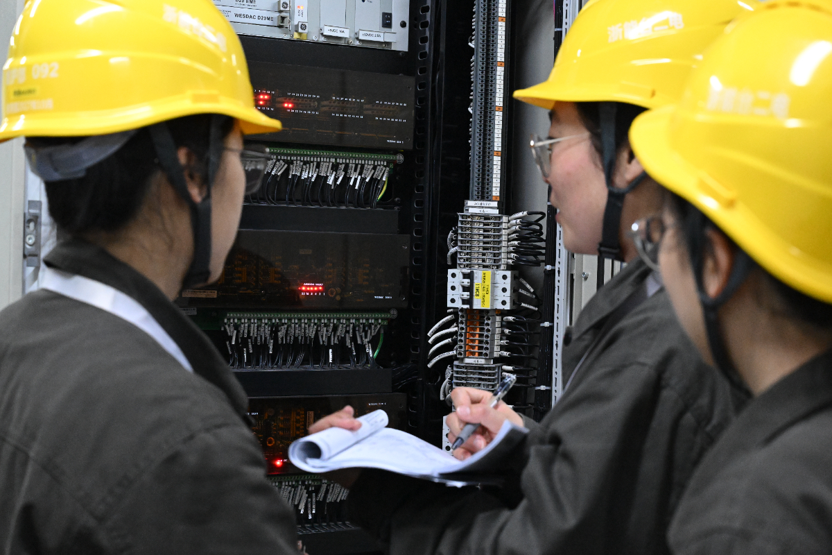 浙能臺二電維護部人員檢查就地電壓。 李澤 攝