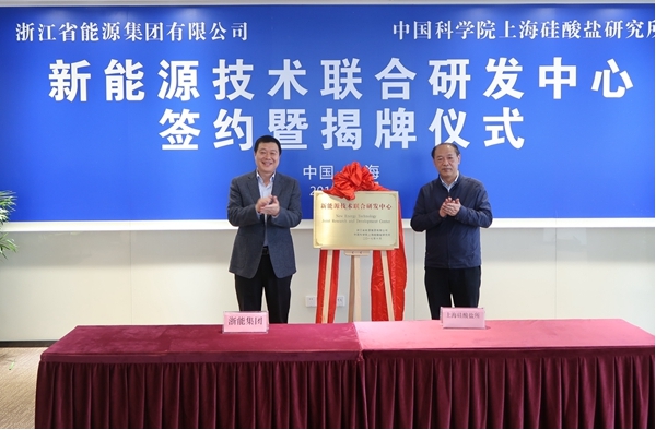 浙能集團(tuán)董事、副總經(jīng)理趙建林與上海硅酸鹽研究所所長宋力昕共同為研發(fā)中心揭牌。關(guān)鍵 攝