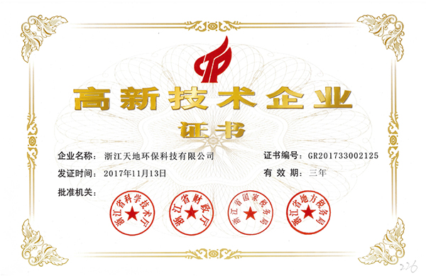 近日,浙江天地環(huán)保科技有限公司獲得了由浙江省科學技術(shù)廳、浙江省財政廳、浙江省國家稅務(wù)局、浙江省地方稅務(wù)局聯(lián)合頒發(fā)的《高新技術(shù)企業(yè)證書。自2008年初次通過國家高新企業(yè)認定以來,天地公司已連續(xù)四次通過國家高新企業(yè)認定。國家高新技術(shù)企業(yè)評定是國家對具有自主知識產(chǎn)權(quán)的高科技企業(yè)的一項扶持政策,是我國科技創(chuàng)新類最高獎項之一。天地公司再次獲得認證標志著該公司在環(huán)境治理行業(yè)創(chuàng)新領(lǐng)域連續(xù)十年得到了國家相關(guān)部門的肯定。