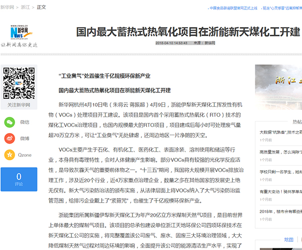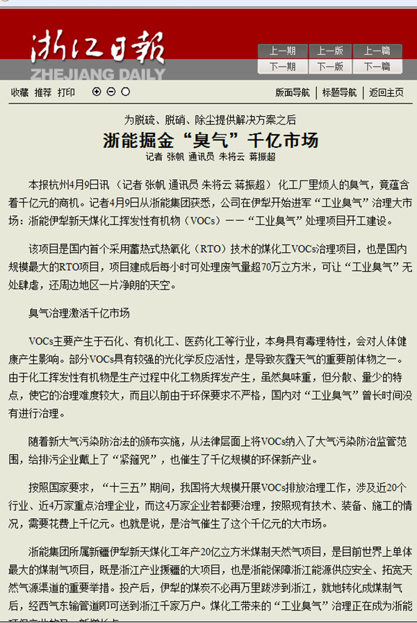 4月10日,《新華網》《浙江日報》分別刊發文章《國內最大蓄熱式熱氧化項目在浙能新天煤化工開建》《浙能掘金“臭氣”千億市場》,報道浙能伊犁新天煤化工揮發性有機物(VOCs)處理項目開工建設,進軍“工業臭氣”治理大市場。