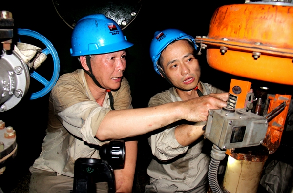 6月27日,長興發電公司檢修人員馮惠江與顧迅對3號機組溫度調節閥進行解體檢查。趙玉寶 攝
