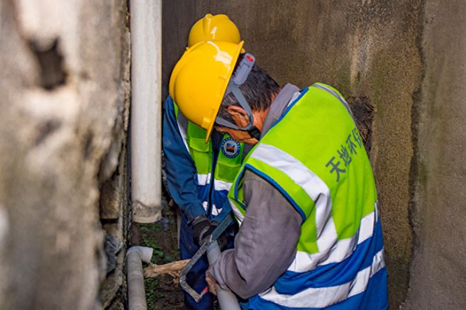 ▲浙能天地環(huán)保公司現(xiàn)場(chǎng)施工人員正在維修村民家污水排放管道。