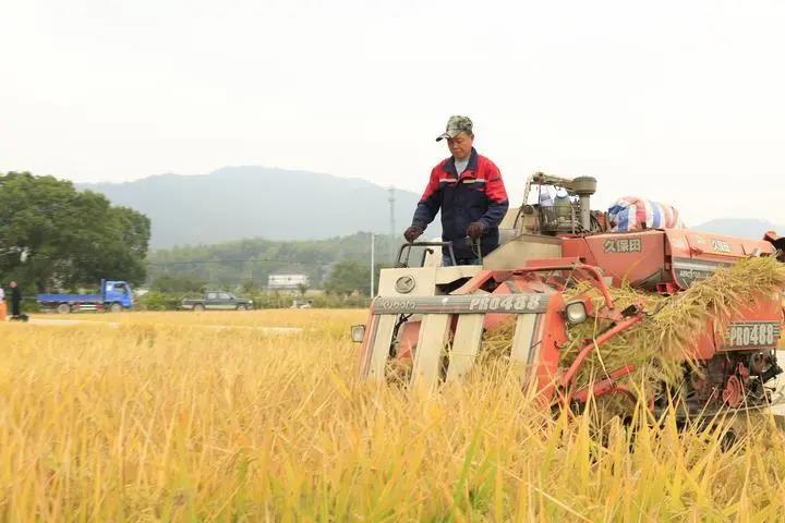 10月14日,浙能長廣集團煤山區域5號復墾地塊,農戶正駕駛收割機割稻。