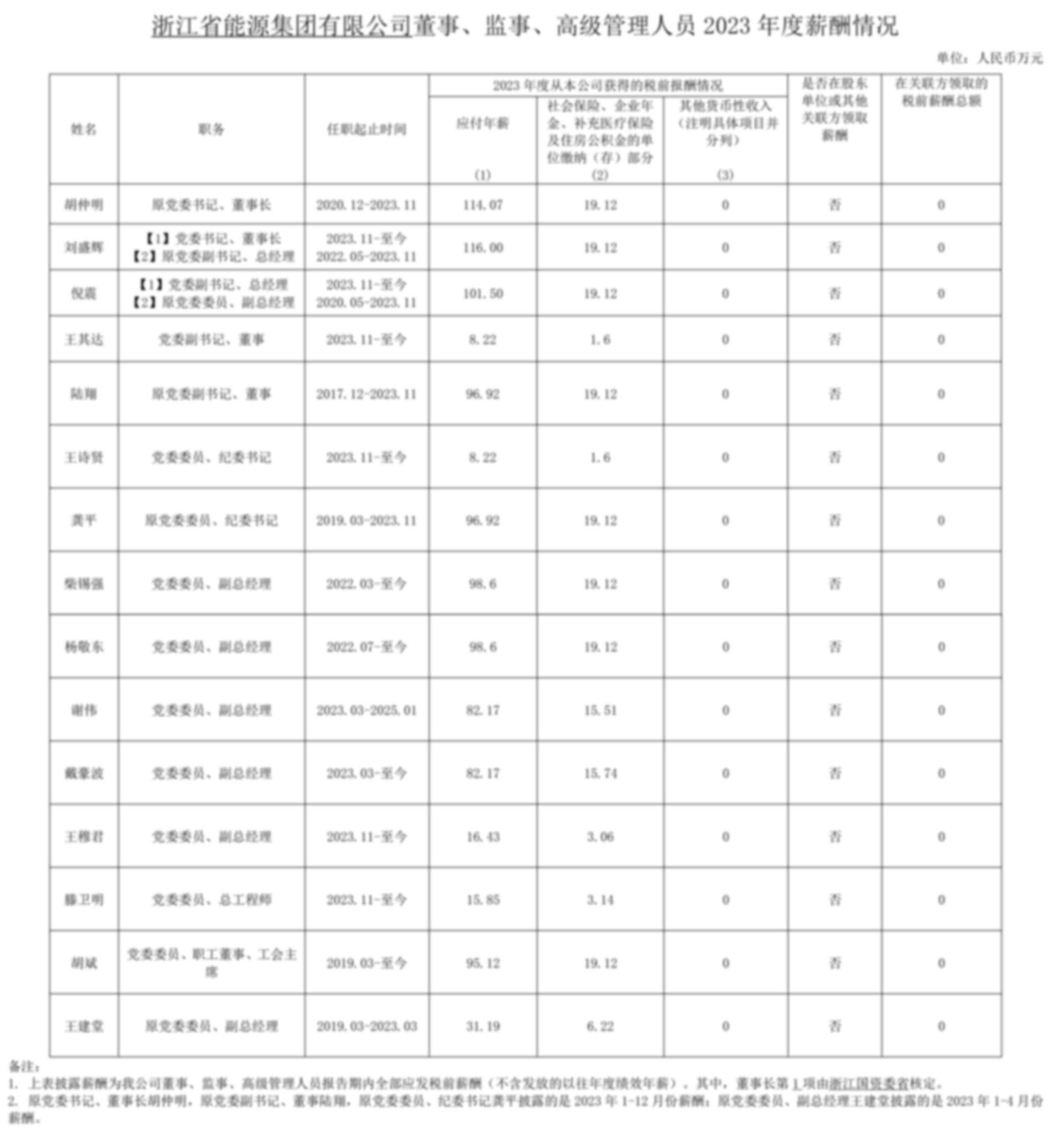 浙江省能源集團有限公司董事、監事、高級管理人員2023年度薪酬情況